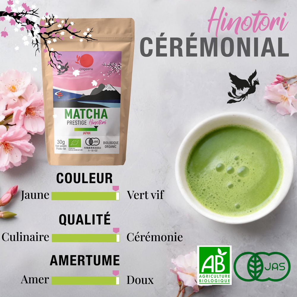 HINOTORI est un thé matcha cérémonial d’exception à la texture veloutée et sans aucune amertume. Inspiré du Hinotori, le phénix japonais, symbole de renouveau et d’harmonie, c’est un thé d’une grande finesse, idéal pur en usucha ou koicha, ou bien pour un matcha latte sans une once d’amertume. Un matcha pour les fins palais, subtil et délicat.